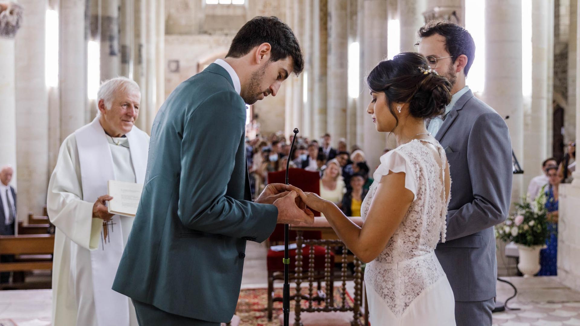 Pierre et Doria ont échangé leurs vœux dans l’église romane de Cunault. La centaine d’invités passait pour un petit comité dans l’immense nef. Le marié est arrivé le premier, tradition oblige ! En attendant la mariée, sur le parvis, des retrouvailles émouvantes et joyeuses en famille ou entre amis, l’occasion pour moi d’immortaliser de jolis souvenirs. 14 h 30, le soleil était au rendez-vous, mais pas de chaleur écrasante. La mariée est arrivée dans son élégante robe en dentelle. Elle a traversé, au bras de son papa, la longue allée décorée de petits bouquets de roses et de gypsophile.